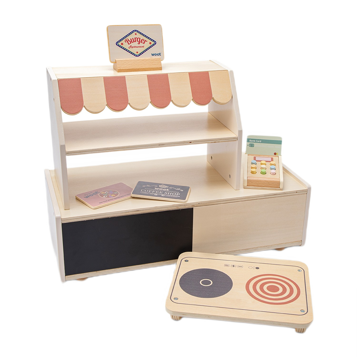 На вашу дитину чекають нескінченні пригоди з дерев'яним ігровим набором Магазин та Ресторан. Цей універсальний кіоск щоразу перетворюється на щось нове: сьогодні це бургерна, завтра — кав'ярня, а післязавтра — піцерія. Завдяки трьом двостороннім тематичним дошкам, які пропонують шість різних варіантів оформлення, включаючи спеціальну табличку "Закрито", діти можуть щодня
