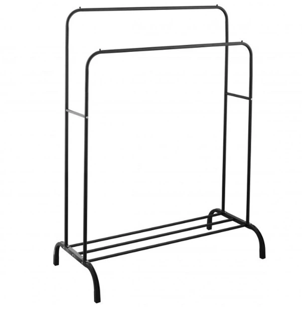 Отдельностоящая двойная вешалка для полотенец изготовлен из стали. Она имеет два кронштейна на разной высоте, что позволяет удобно развешивать вещи. Внизу имеется полка для аксессуаров.Характеристики :Бренд : YokaСтрана производитель : ПольшаЦвет : черныйМатериал : стальВысота (см) : 148Ширина (см) : 110