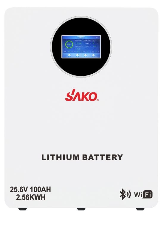Sako Li-Sun series SK-25.6V100Ah – літій-залізо-фосфатна акумуляторна батарея напругою 25.6 В та ємністю 100 А·год / 2560 Вт·год, складова системи накопичення енергії. Максимальний струм заряду/розряду 50 А/100 А. Ресурс: 6000 циклів заряджання-розряджання. Комунікаційний порт RS485. Вбудовані Wi-Fi та Bluetooth для моніторингу стану батареї. В одну систему можна підключити до 15 акумуляторних батарей. Настінний