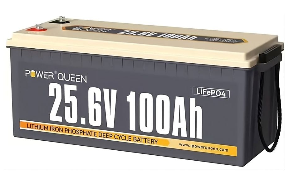 Акумуляторна батарея літій-залізо-фосфатна (LiFePO4) з Bluetooth; ємність 100 А·год (2560 Вт·год); напруга 25.6 В; макс. струм заряду 100 А / розряду 100 А; кількість циклів: >4000; підключення через Bluetooth до мобільного застосунку Power Queen для моніторингу та керування параметрами акумуляторної батареї; тип клем M8; можливе послідовне підключення до 2 батарей та паралельне до 4 батарей; захист від заряджання