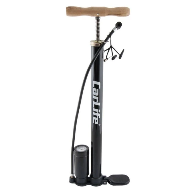 Насос ручний CARLIFE з манометром, розмір циліндра 38х500мм, складні ніжки, дерев'яна ручка, адаптери, 10 Атм.