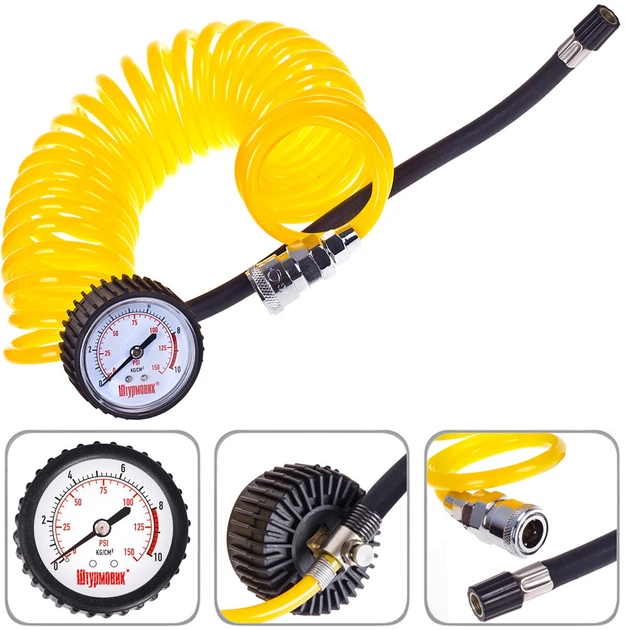 Шланг для підкачування коліс від компресора спірального під швидкозйом 5м манометр, дефлятор Штурмовик