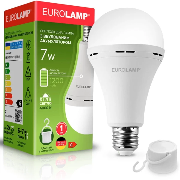 Світлодіодна лампа із вбудованим акумулятором Акумулятор ємкістю 1800 мАг дозволить працювати лампі автономно до 6 годин. У звичайному режимі лампа працює від мережі 220В. У разі відсутності напруги в мережі – лампа автоматично переходить в автономний режим роботи від акумулятора і далі керується штатним вимикачем. Світловий потік у звичайному режимі - 806 Лм, в автономному режимі перша година роботи - 300 Лм, далі світловий потік буде зменшуватися, остання година роботи - 50 Лм. Автоматичне заряджання Заряджання акумулятора відбувається автоматично – під час роботи лампочки від мережі 220В.  Просте встановлення Лампу можна використовувати у патроні під цоколь E27. Додатково є гачок для кріплення лампи в будь-якому зручному місці. Безпечні матеріали Лампа не містить ртуть та інші шкідливі речовини.