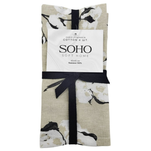 Особливості/З принтом|Матеріал/Бавовна|Бренд/SOHO|Розмір/40 х 40 см|Базовий колір/Бежевий|Щільність матеріалу, г/м²/170 г/м²|Застосування/Кухонне, Для рук|Серія/Cotton|Кількість в упаковці, шт/4 шт|Тематика/Природа|Країна виробництва/Китай