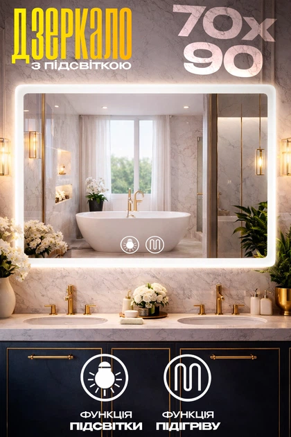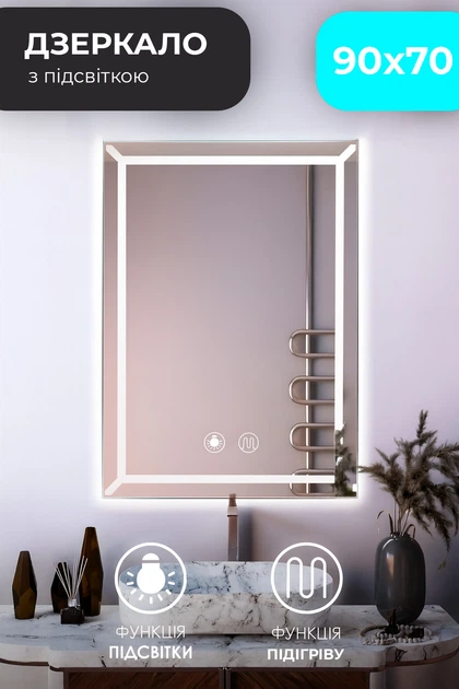 Дзеркало з підсвіткою LED 90х70 см для ванної кімнати настінне смарт дзеркало з підігрівом BRS
