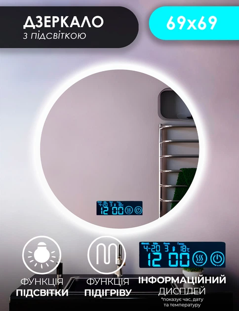Дзеркало з підсвіткою LED 69х69 дзеркало для ванної кімнати настінне смарт дзеркало з підігрівом та дисплеєм BRS