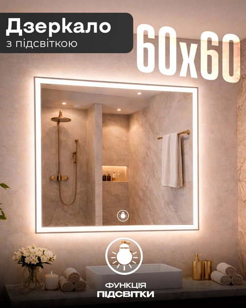 Дзеркало з підсвіткою 60х60 см дзеркало для ванної кімнати LED смарт дзеркало настінне BRS