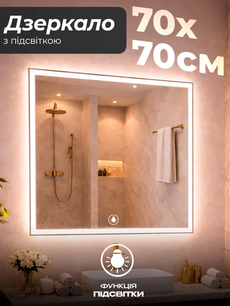 Дзеркало з підсвіткою 70х70 см дзеркало для ванної кімнати LED смарт дзеркало настінне BRS