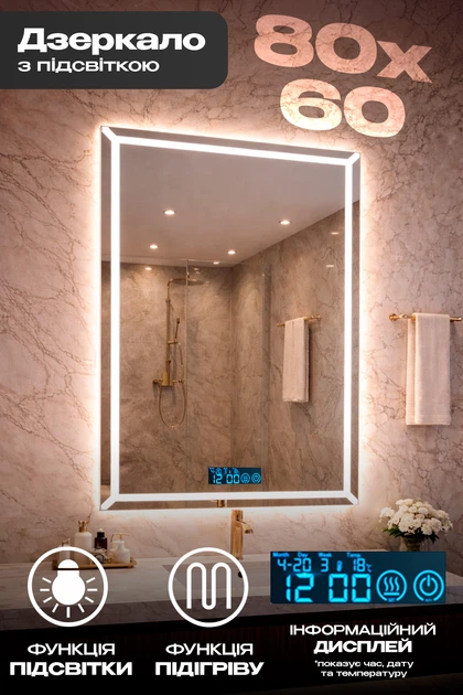 Дзеркало з підсвіткою LED 80х60 см дзеркало для ванної кімнати смарт дзеркало світлодіодне з підігрівом та дисплеєм BRS