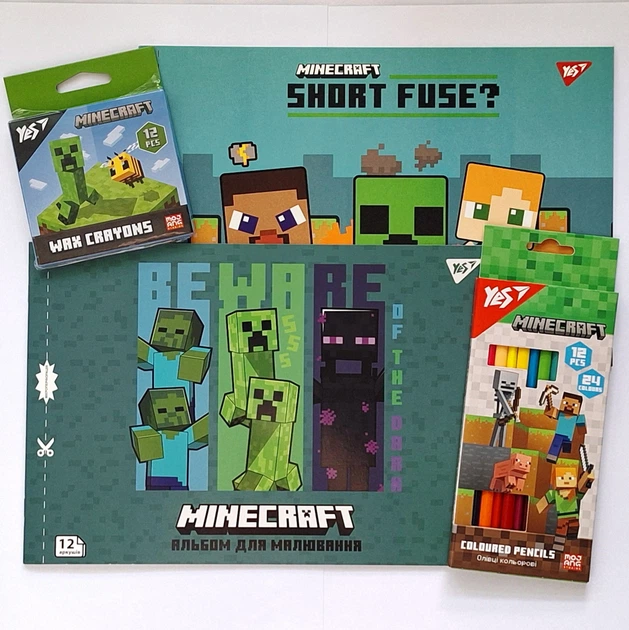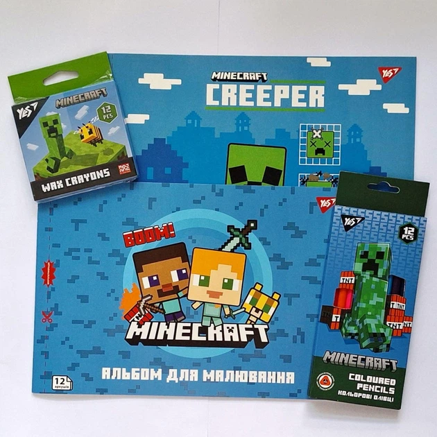 Набір №3 для школяра з альбомів для малювання А4 12 скоба з перфорацією Minecraft, олівці 12/24, воскові мелки 12 кольорів