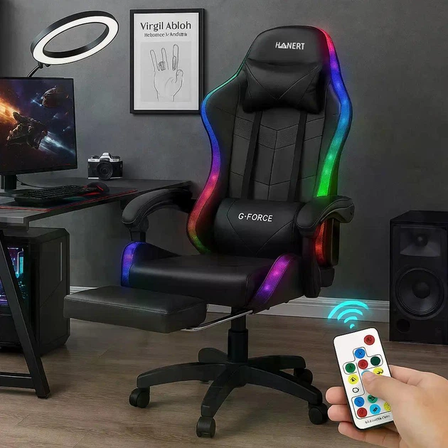 Геймерське крісло Hanert GForce Black + RGB з підсвіткою та підставкою для ніг