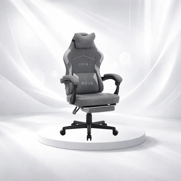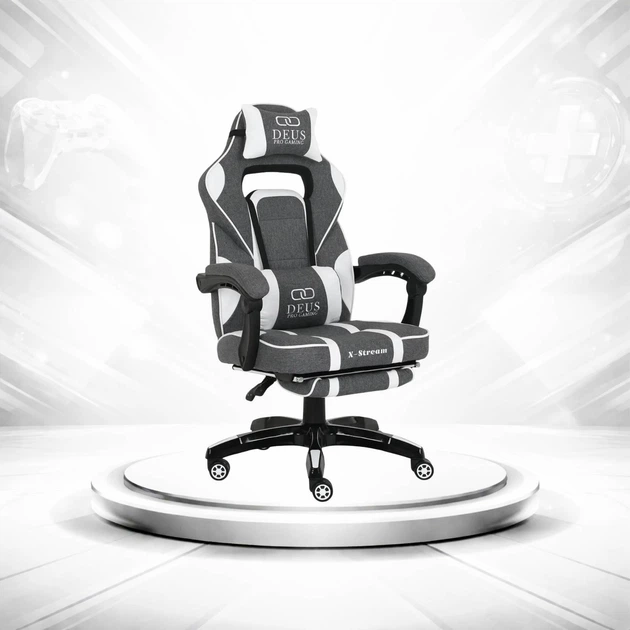 Комп'ютерне крісло DEUS X-STREAM Сіро-білий, для геймерів з підставкою для ніг та м'якими підлокітниками
