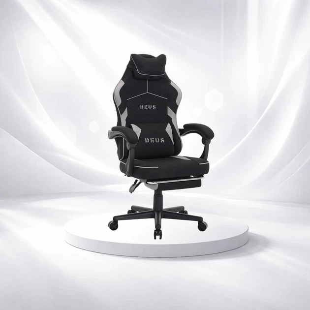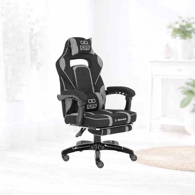 Геймерське крісло DEUS X-STREAM тканинне з підставкою для ніг та з подушками, чорно-біле