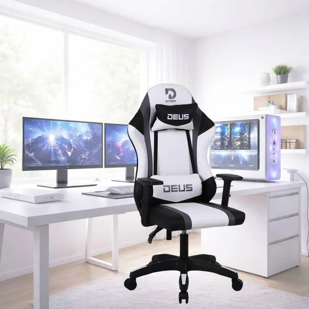 Ігрове крісло DEUS Storm Чорно-біле з екошкіри з посиленою конструкцією та спинкою 75 см