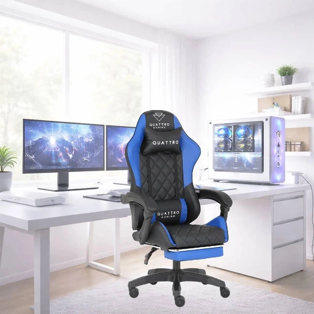 Ігрове крісло CARBON Quattro Gaming Чорно-синє з карбоновими акцентами та висувною підставкою для ніг