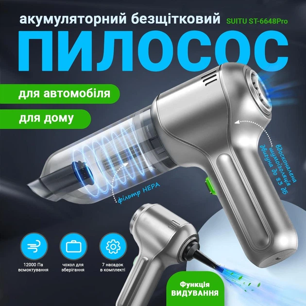 Автомобільний портативний пилосос 3в1 SUITU ST-6648Pro Max, універсальний, бездротовий, безщітковий, 12000 Па, срібний