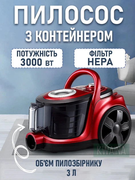 Пилосос циклонний 3000 Вт з HEPA-фільтром, контейнером 3 л, низьким рівнем шуму і насадками для швидкого та ефективного приб