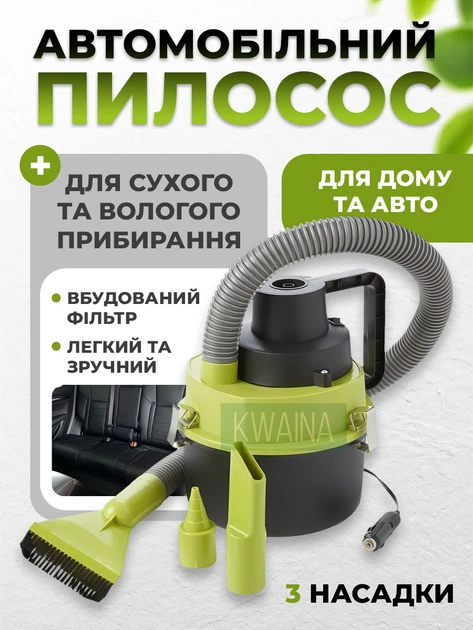 Автомобільний пилосос для сухого та вологого прибирання, потужний пилосос з 3 насадками 12V від прикурювача