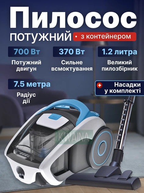 Контейнерний пилосос для сухого збирання з контейнером без мішка на 700 Вт HEPA-фільтр об'єм 1,2 л.