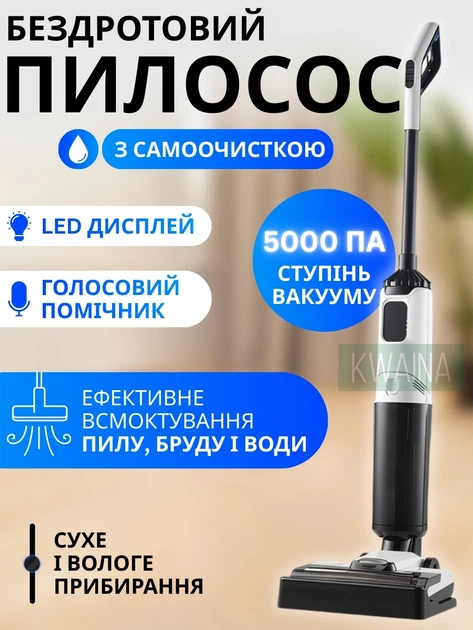 Миючий пилосос акумуляторний бездротовий для сухого та вологого прибирання, LED дисплей, голосовий помічник, самоочищення