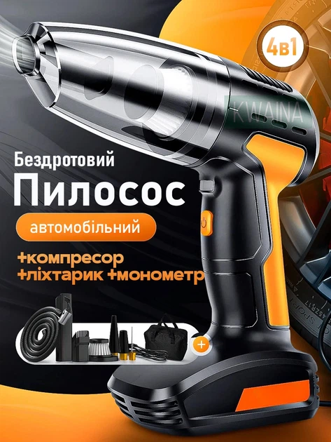 Бездротовий портативний пилосос 4в1 з компресором, монометром та ліхтариком, потужність 120W, колір чорний