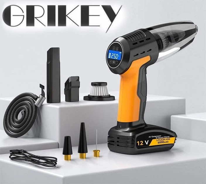 Автомобільний портативний пилосос GRIKEY 5W для сухого та вологого прибирання з 3 насадками, 140W, 7000 Pa, Чорний (GK410)