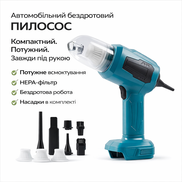 Автомобільний портативний бездротовий пилосос 2 in 1 Xtrobb 16726 акумуляторний ручний на 120 Вт фільтр і 2 насадки USB заря