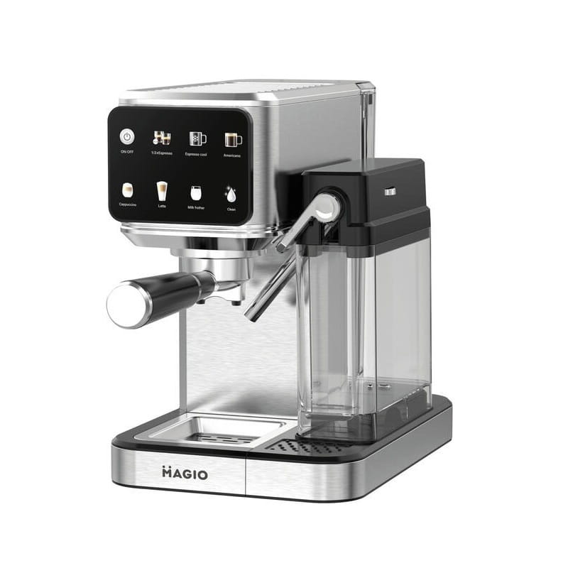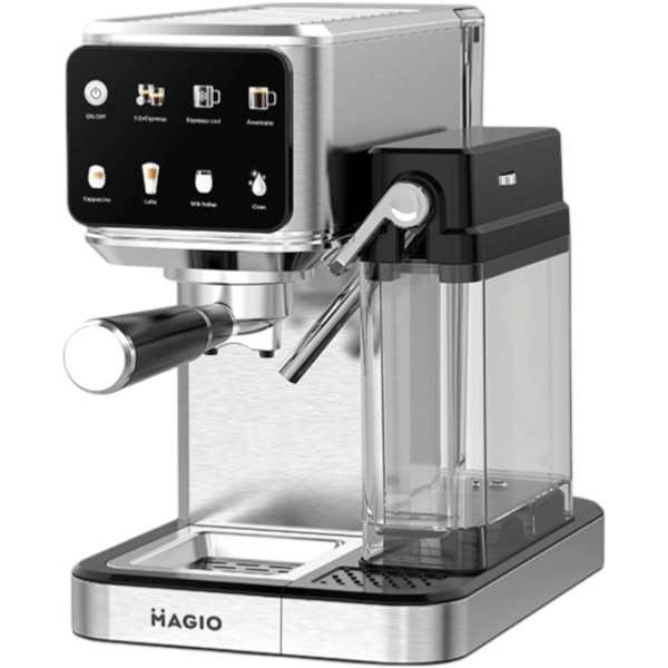 Кавоварка рожкова Magio MG-455 Кавоварка Magio MG-455 - це сучасна ріжкова кавоварка, призначена для приготування ароматного еспресо та кавових напоїв на його основі. Пристрій оснащений потужною помпою з тиском до 20 бар, що забезпечує правильну екстракцію кави та насичений смак напою. Сенсорне керування та дисплей роблять використання кавоварки простим та зручним. Завдяки вбудованій