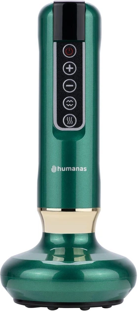 Компактний масажер для тіла Humanas HS4466 поєднує три методи догляду — вакуумне банкування, роликовий масаж кульками і підігрів до 45°C — щоб стимулювати мікроциркуляцію, лімфодренаж і прискорити виведення токсинів; 12 рівнів підтиску та 12 рівнів температури дозволяють регулювати інтенсивність від ніжного дренажу до інтенсивнішого впливу, а вбудований таймер і підсвічений екран