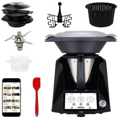 Багатофункційний кухонний комбайн Cobbo 7 Termorobot TC-7B — потужний і компактний помічник для дому: 1500 W мотор забезпечує ефективне подрібнення, меленя та віджим соку, режим «пульс» і кілька швидкостей дають точний контроль консистенції, насадки для меленя, подрібнення та віджиму дозволяють готувати фарш, соуси, салати та свіжі соки; корпус із міцного пластику в чорному виконанні