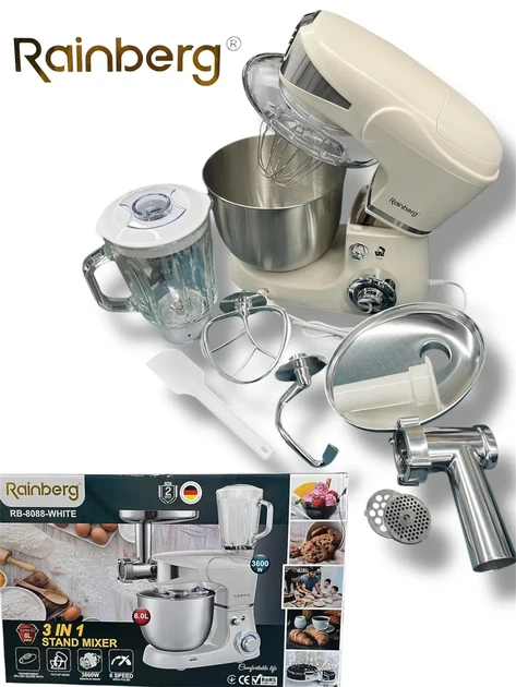 Кухонний комбайн 3в1 Rainberg RB-8088 Білого кольору Кухонна машина-тістоміс на 6л з м'ясорубкою та блендером Планетарний мі