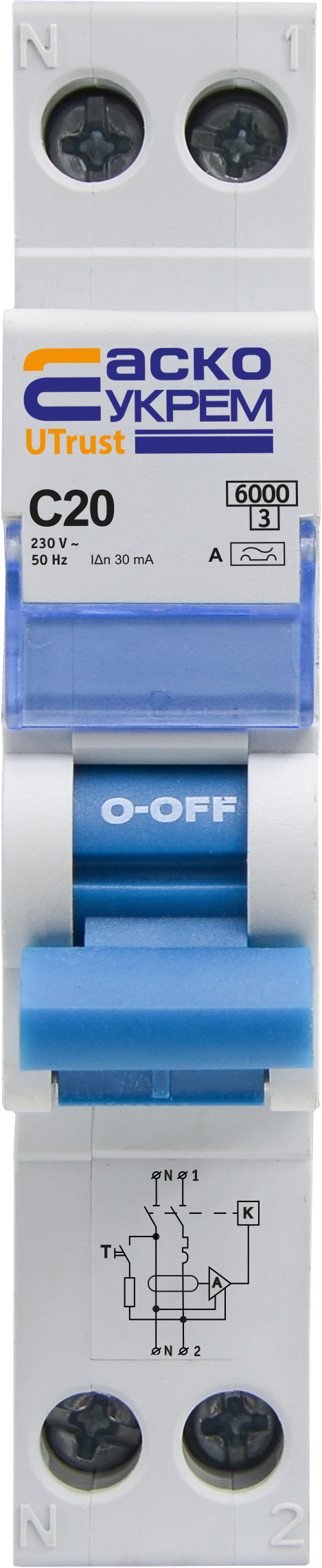 Пристрій захисного відключення з захистом від надструмів UTrust 1P+N (18 mm) 20А C 30mА AC A0010210145