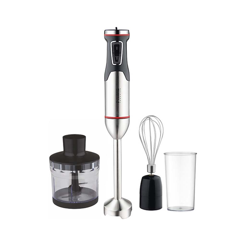 Матеріал ніжки-блендера: метал; Джерело живлення: мережа; ніж для подрібнення; віничок: віничок; Насадки: ніжка-блендер; мірна склянка; Передустановлені програми: Ємності: чаша для подрібнення; Імпульсний режим; Турборежим; Плавне регулювання швидкості; Кількість швидкостей: 5; Потужність (Вт): 1000; Чаша для подрібнення: 500; Тип пристрою: заглибний (ручний) блендер