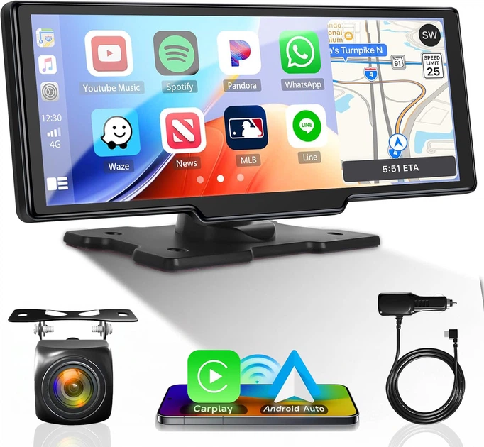 Портативний автомобільний мультимедійний монітор 10.26" з Apple CarPlay, Android Auto та камерою заднього виду