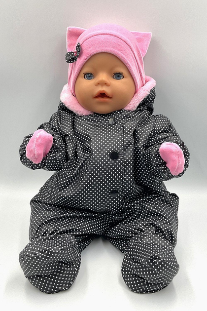 Комбінезон чорний у горошок з рожевою шапкою та рукавичками - зимовий одяг для пупсу типу Baby Born 42 - 43см