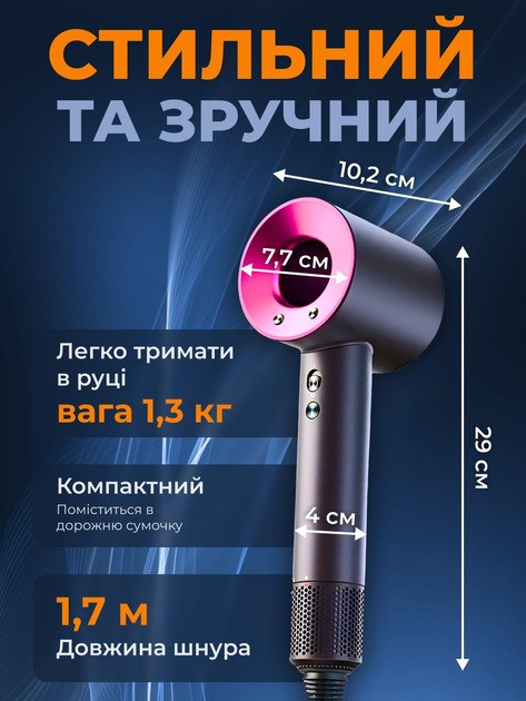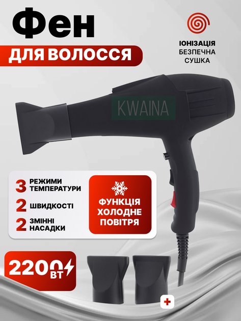 Професійний фен для волосся з іонізацією + 2 насадки, 2200Вт 3 температурні режими, 2 швидкості, функція холодне повітря, шн