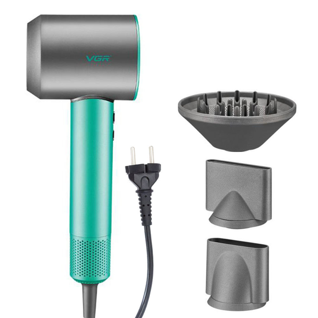Фен професійний VGR V-440 11000 об/хв зелений з 3 насадками та функцією іонізації волосся