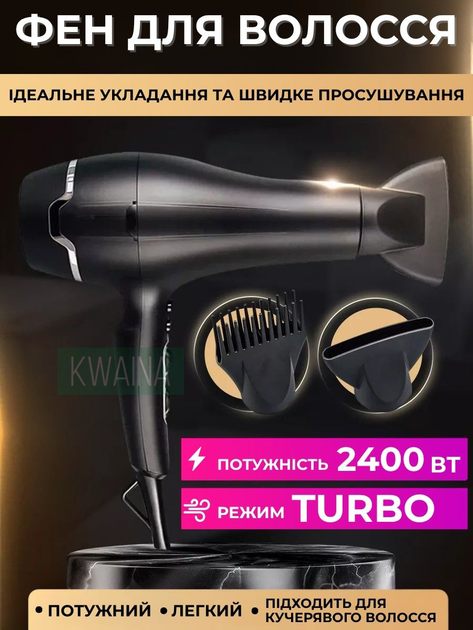 Професійний потужний фен з функцією іонізації, 2400 Вт, три температурні режими та два режими швидкості, Чорний
