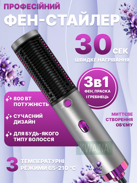 Мультистайлер браш фен, гребінець, випрямляч та плойка 3 в 1 на 800 Вт, фен-щітка для укладання волосся з іонізацією, Сірий