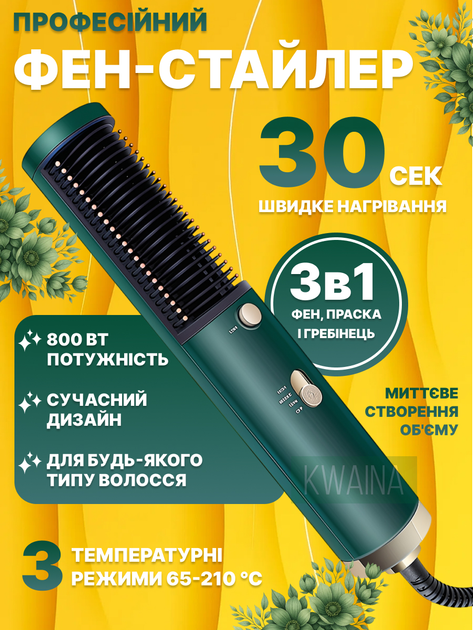 Мультистайлер браш фен, гребінець, випрямляч та плойка 3 в 1 на 800 Вт, фен-щітка для укладання волосся з іонізацією, Зелени