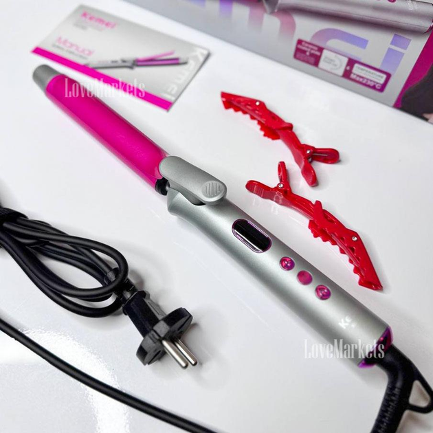 Товста плойка для завивки волосся діаметр 25 мм з регулюванням температури Kemei KM-2303 з затискачем Рожева