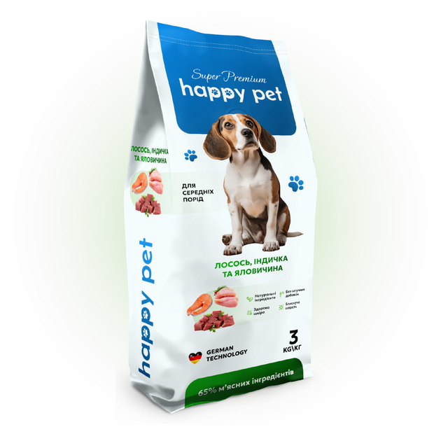 Сухий корм для собак середніх порід Happy Pet на основі 3-х видів м'яса 3 кг