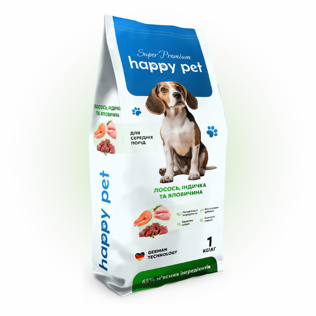 Сухий корм для собак середніх порід Happy Pet на основі 3-х видів м'яса 1 кг