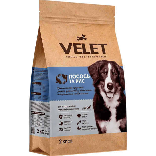 Сухий корм для дорослих собак середніх та великих порід Velet (з лососем та рисом) - 2кг