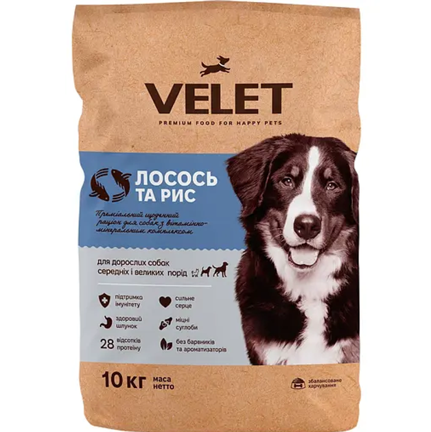 Сухий корм для дорослих собак середніх та великих порід Velet Лосось та Рис - 10 кг