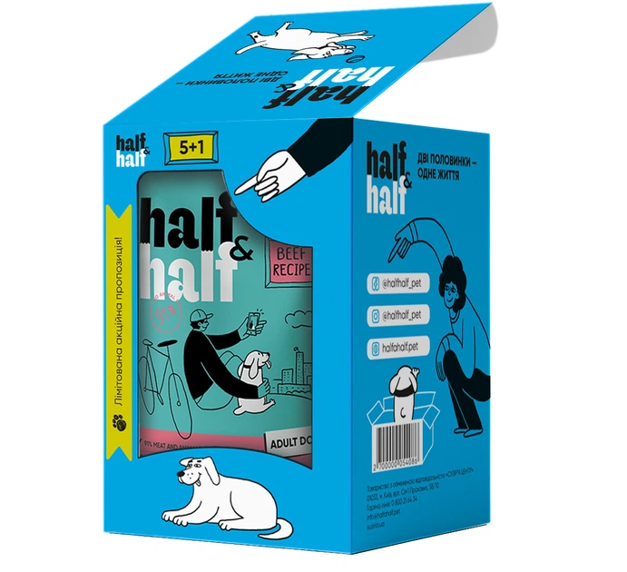 Консервований корм Half&Half Набір вологих кормів "5+1" для дорослих собак, шматочки з яловичиною в соусі 6 шт х 100 г (1111