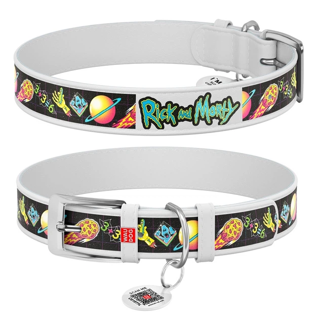 Нашийник для собак середніх порід шкіряний WAUDOG Design Rick and Morty 3 L білий, довжина 38–49 см, ширина 25 мм, з QR-пасп