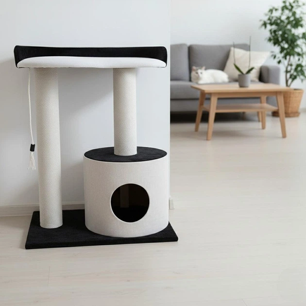 Котяча кігтеточка дряпка Венді 2 з будиночком для кота, кішки у хб канаті 70х60х40см біло чорна