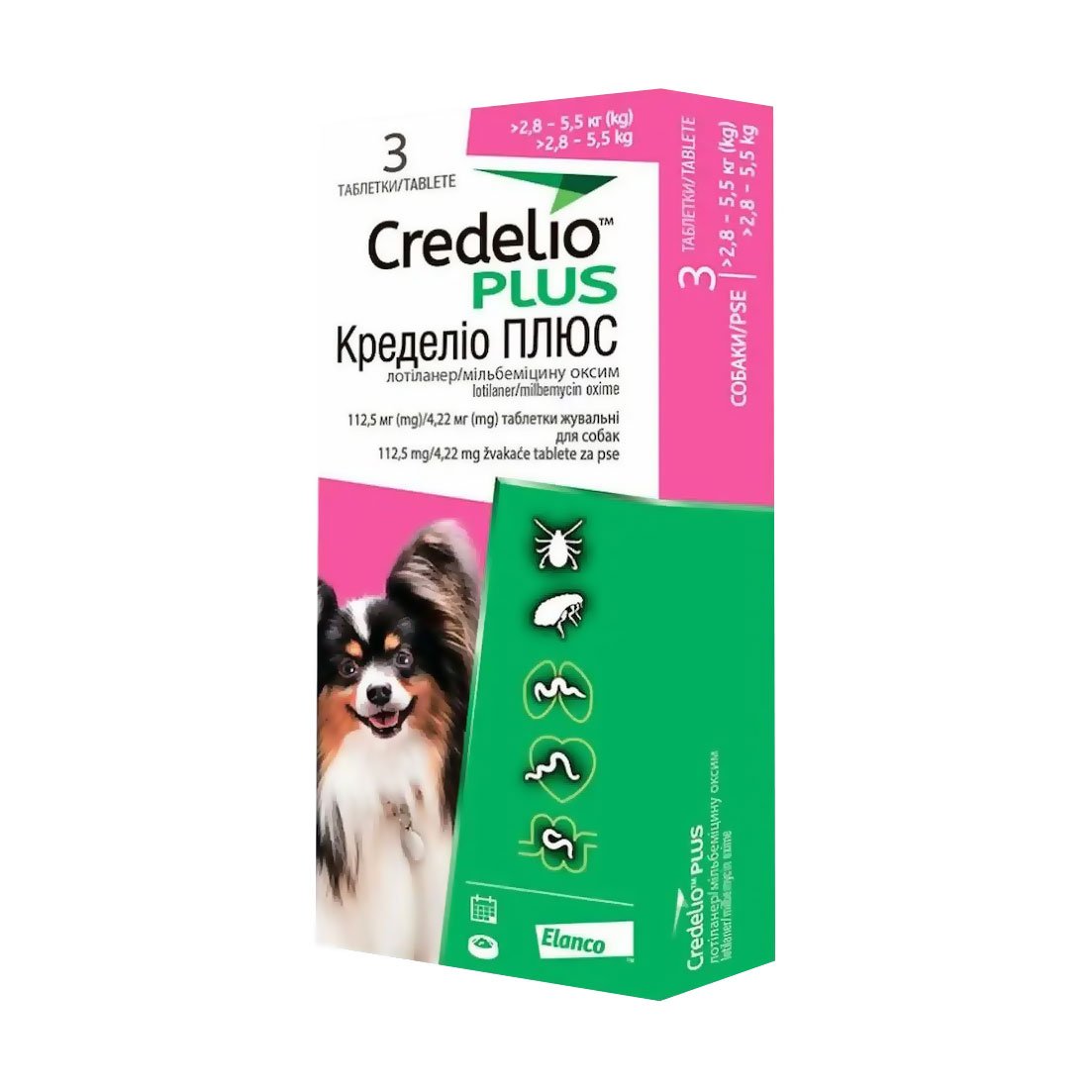 Жувальні таблетки для собак Elanco Credelio Plus від бліх, кліщів та гельмінтів, від 2.8 до 5.5 кг, 3 шт