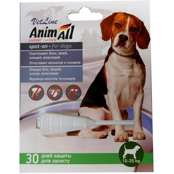 AnimAll VetLine spot-on для собак - комбінований інсектоакарицидний препарат, який застосовується для профілактики й лікування собак при хворобах, викликаних ектопаразитами. Одноразова обробка препаратом захищає тварин від ураження блохами та кліщами протягом 4-х тижнів. Рекомендації щодо застосування: Препарат наносять на неушкоджену, суху шкіру. Утримуючи тюбик-піпетку вертикально, відламати наконечник. Розділити шерсть тварини та нанести препарат безпосередньо на шкіру між лопатками біля основи шиї. При обробці великих тварин препарат наносити на шкіру в 3-4 місцях уздовж хребта, від холки до хвоста. Загибель паразитуючих на тварині комах після обробки відбувається протягом 12 годин, загибель або відкріплення кліщів - протягом 48 годин. Після одноразової обробки тварини, репелентна дія триває до 4 тижнів. Повторні обробки при необхідності проводять 1 раз на місяць.